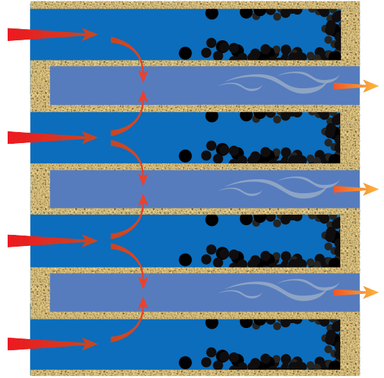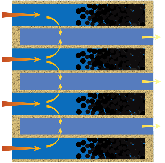 Exhaust gasses containing soot enter the DPF. The filter traps any matter larger than one micron, allowing gasses through.